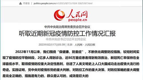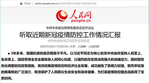 昨天,中共中央政治局常务委员会召开会议,听取近期新冠疫情防控工作情况汇报。当局宣称,3年多来,以习近平为核心的党中央因时因势优化调整防控政策措施,成功避免了致病力较强、致死率较高的病毒株的广泛流行,有效保护了人民群众生命安全和身体健康,为打赢疫情防控阻击战赢得了宝贵时间。值得注意的是,当局特别提到,去年11月放开以后,较短时间实现了疫情防控平稳转段,新冠死亡率保持在全球最低水平,取得疫情防控重大决定性胜利,创造了人类文明史上人口大国成功走出疫情大流行的奇迹。实践证明,党中央对疫情形势的重大判断、对防控工作的重大决策、对防控策略的重大调整是完全正确的,措施是有力的,群众是认可的,成效是巨大的。习近平当局的这个说法,引起了海内外一片震惊。这样的公然撒谎、这样的厚颜无耻,超出了很多人的想象。毕竟,无数中国人还沉浸在失去亲人的悲痛和恐慌之中,还没有从这场疫情的狂飙中平静下来。
