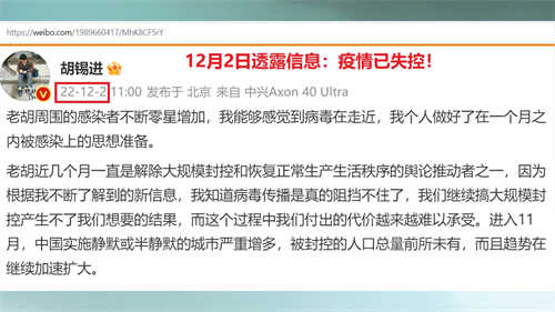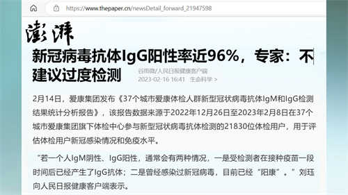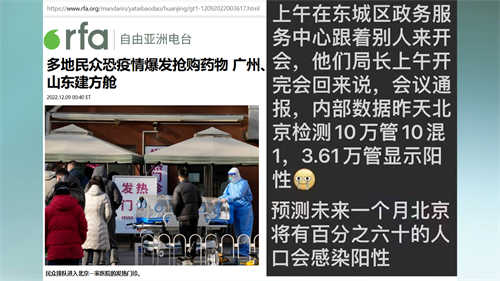 值得一提的是,三天前,人民日报刊出一则消息,“中国全国新冠病毒抗体IgG检测,阳性率近96%”。消息说,在全国参与新冠病毒抗体IgG检测的人群中,约96%的用户检出新冠病毒抗体IgG阳性。96%体检人群有IgG抗体,说明在这次被调查的体检人群中多数已经接种过疫苗或者既往已经感染过新冠病毒。需要指出的是,在此之前,有关当局一直在或明或暗地阻止人们检查接种疫苗是否有效,是否出现了抗体,当局更是没有进行过这类大规模调查。相反,而是把精力都用在核酸检测上。显然,当局也对国产疫苗能否产生抗体缺乏信心,事实上,就是接种了国产疫苗,也一样会被感染。可以推断,96%体检人群有抗体,也就基本上等于96%的人在这一波疫情中被感染了。《人民日报》刊出的这个消息等于告诉外界,几乎所有的中国人都已经被感染过了,这一波人类历史上空前规模的疫情基本上过去了。用中共当局的话说,这一波疫情已经平稳渡过了。想必是这个原因,中共中央政治局常务委员会才召开会议,听取近期新冠疫情防控工作情况汇报。
