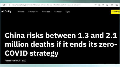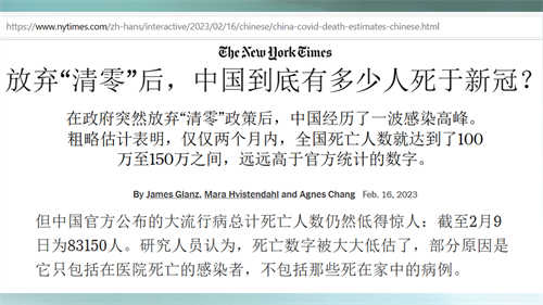 如果从12月7日当局推出防疫新十条、正式放开之后算起,到90%的人口被感染,大约只用了不到两个月的时间。这样的感染速度和规模在其他国家还没有先例,它所造成的严重恶果也一定会超出其他所有国家。去年年末,中共当局先后公布了两次疫情死亡总数,第一次是6万多人,第二次,承认累计死亡8万多人。习近平当局所谓新冠死亡率保持在全球最低水平的说法,无疑是按照8万多人的疫情死亡总数做出的结论。只是,8万多人疫情死亡的说法,中共当局自己恐怕都不会相信,单单一个北京市八万人都不止。也在昨天,美国《纽约时报》中文网刊登了一篇文章,“放弃清零后,中国到底有多少人死于新冠”,其中提到,四个互无关联的学术团队的研究结果显示,在过去两个月,中国因为染疫死亡的人数大约在100万至150万,远远高于中共当局公布的8万多人的疫情死亡总数。只是,还不知道,他们的研究是否考虑了中国这一波疫情的特殊情况,也就是突然有十几亿人被感染,在加上缺医少药,会出现其他国家不会出现的严重恶果。此外,还有一个分析数据曾经得到众多国际媒体报道过,那就是在中共当局放开后不久,英国健康数据公司Airfinity发布的研究结果,他们估计,当时中国每日新增感染人数在百万以上,每天可能有5000多人死于病毒感染。只是,当时,中国每天的感染人数已经是数千万,是他们估计的几十倍。早在11月28日,这家公司就发出过预警,中国如果突然放宽严格的清零政策,可能会导致1.67亿至2.79亿人感染,130万至210万例死亡,其中大部分是未接种疫苗的老年人。然而,中国这一波疫情,实际感染人数超过12亿,是这家英国专业公司估计的最大值的四倍多。死亡人数如果也是四倍的话,也将超过840万,是中共当局公布数字的一百倍。