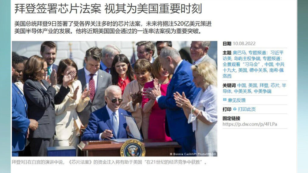 事实上,这些年来,由于习近平当局的内外政策,已经让美国各界对中国产生了极大的担心。美国情报机构明确表示,中国对美国的经济和国家安全构成最大威胁,美国五角大楼则认定,中国是他们的长期的、头号挑战,大多数美国人也都认为中国是美国目前面临的最大的威胁。事到如今,美国已经公开地把中共当作了战略对手来加以防范。就在几天前,拜登政府宣布,接受联邦政府资金补贴的美国科技公司将被禁止在中国建设拥有先进技术的工厂,禁令有效期10年,此外,美国政府还禁止美国芯片企业向中国出口用于人工智能的顶级芯片。上个月,拜登签署了《芯片和科技法案》,根据该法案,为了确保美国芯片供应的安全,美国将对本国半导体行业投入500多亿美元的补贴,重振美国半导体生产。这项法案的出台原本就和台海局势有关,就和中共有关,目的就是要逐步摆脱对台湾出产的芯片的依赖,以防万一。而美国政府这项禁令,则是把矛头公开指向了中共,有专家认为这是真的在对中国鸣枪示警。