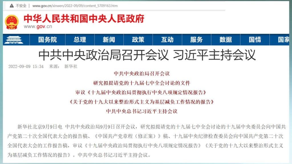 8月底召开的政治局会议,确定了19届7中全会和20大召开的时间,这意味着大局已定。紧接着,中共政治局在9月9日召开会议,听取二十大报告草稿、党章修正案征求意见的情况报告,根据这些意见确定二十大报告、党章修正案进行修改和完善的基本方向。考虑到19届7中全会将在10月9日召开,所以,这次的政治局会议提前在9月9日召开,也就是在19届7中全会召开前一个月举行,以便有充足的时间,正式完成20大报告和党章修正案。届时,交由19届7中全会正式审议。从这一点来看,这次政治局会议召开的时间并没有值得奇怪的地方。假如还按照惯例在月底举行,那么,20大报告进行修订的时间就只有8、9天,那就太仓促了。应该说,20大会议相关事项的准备基本是在按部就班地进行,并没有出现任何意外。