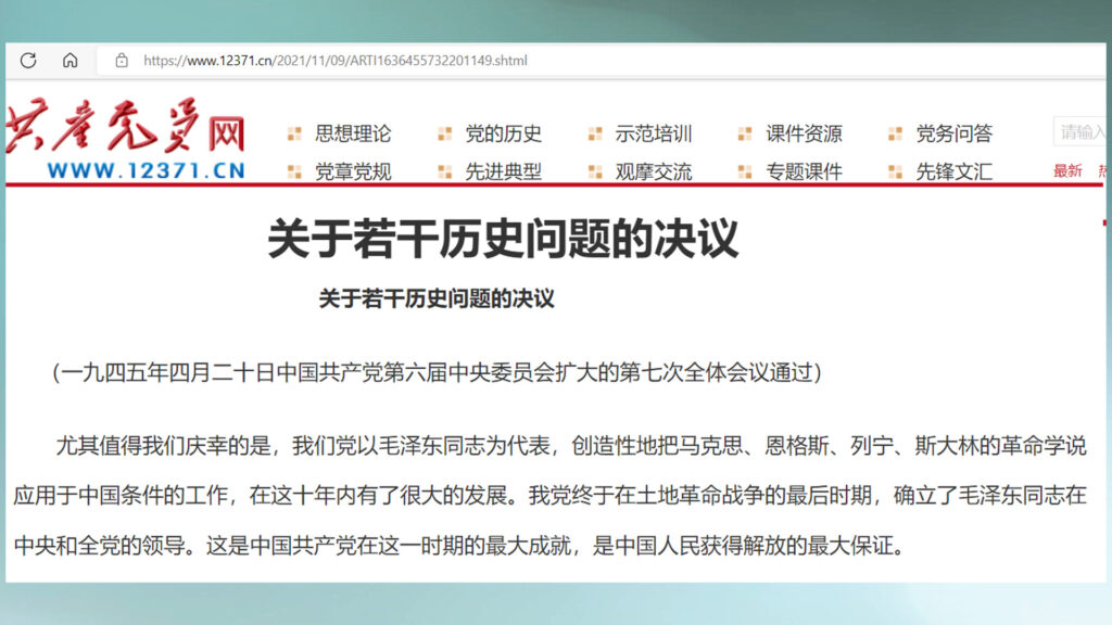 毛泽东在延安推出的《关于若干历史问题的决议》其中写道:尤其值得我们庆幸的是,我们党以毛泽东同志为代表,创造性地把马克思、恩格斯、列宁、斯大林的革命学说应用于中国条件的工作,在这十年内有了很大的发展。我党终于在土地革命战争的最后时期,确立了毛泽东同志在中央和全党的领导。这是中国共产党在这一时期的最大成就,是中国人民获得解放的最大保证。