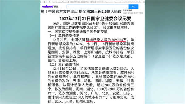前天,网上流传着一个内部报告,一份国家卫健委的会议纪要显示,20日这一天全国新增感染人数接近3700万人;12月1日至20日累计感染已达2.48亿人,占总人口的17.56%。单日新增3700万人,这个数字是当局正式发布数字的一万倍。按照这样的速度,三天时间就会有超过一亿人被传染。单日新增3700万人,这个数字震惊了国际社会。外界虽然无法证实这份纪要的真实性,但是,这个数字肯定比他们正式公布的信息更加符合人们的感觉,更符合人们对现实的认知。事到如今,没有人可以否认,仅仅半个月的时间,北京市绝大多数人都已经被传染。这就意味着,单单北京市每天感染人数就在百万左右。在全国已经彻底放开的情况下,考虑到整个华北、整个北方、整个国家的情况,已经是多中心发散,遍地开花,每天的感染人数应该在几千万的规模。