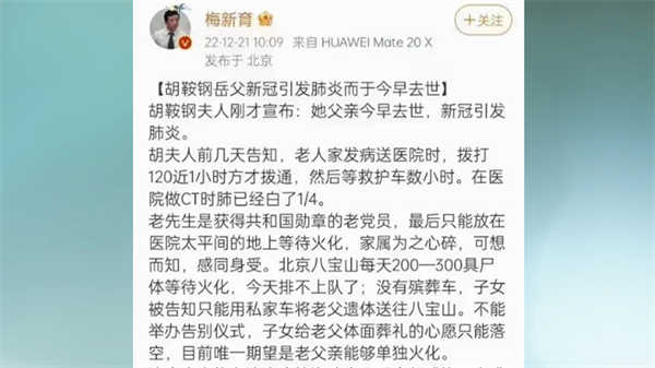 事实上,这些天,不断有北京等地医院、殡仪馆大量尸体随处安放的影像流出。根据一些国际媒体的报道,从12月10日前后,北京市所有的殡仪馆都开始24小时连续运转,就是这样,多家殡仪馆的预约都排到了一个月以后。据网上的消息,若是提前火化,需要支付6万元。现在,各医院的太平间、各家殡仪馆存放遗体的设施都已经饱和,原本存放一具遗体的冰柜,现在可能要放置两具,更令人震惊的是,可能多具遗体一起火花。这也就意味着,目前殡仪馆实际火化的数量早已超过设计的极限数字。四天前,著名学者梅育新在微博上发文谈到胡鞍钢的岳父感染病毒去世。博文写道,老先生是获得共和国勋章的老党员,最后只能放在医院太平间的地上等待火化,家属为之心碎。北京八宝山每天200—300具尸体等待火化,今天排不上队了;没有殡葬车,子女被告知只能用私家车将老父遗体送往八宝山。不能举办告别仪式,子女给老父体面葬礼的心愿只能落空,目前唯一的期望是老父亲能够单独火化。胡鞍钢是深受当局器重的著名谋士,胡鞍钢的妻子也非等闲之辈,他们的唯一的期望竟然是老人能够单独火化。那普通的百姓又能如何呢?显然,为了加速遗体的火化,北京的殡仪馆已经不管不顾了。由此可以想象,北京市死于这波疫情的人数该是多么巨大。不仅北京市的情况如此严重,北方的多个城市、长江沿岸的一些城市、甚至南方的一些城市也都有类似的消息传出。虽然,外界无法获得准确的死亡数据,但是,可以肯定,死亡人数已经大大超出了正常情况,大大超出各地殡仪馆容纳的极限。