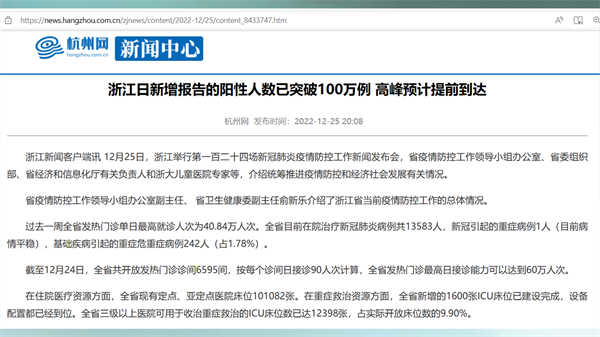 同样在今天,浙江省有关当局宣布,目前,浙江单日新增报告阳性人员数已突破100万例,根据近期病例监测和社区抽样调查结果,对感染情况进行预测,预计浙江高峰将提前到达,在元旦前后进入高位平台期,期间每天新增阳性人员最高将达200万,高峰期预计维持一周左右。浙江当局首度公开疫情的真实规模,公布当天真实的感染数字,这个情况很值得注意。这或许是在告诉外界,最高当局已把防疫的责任完全推给了地方。