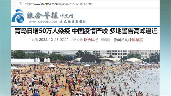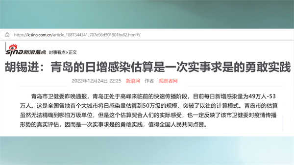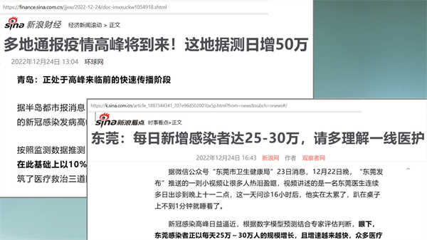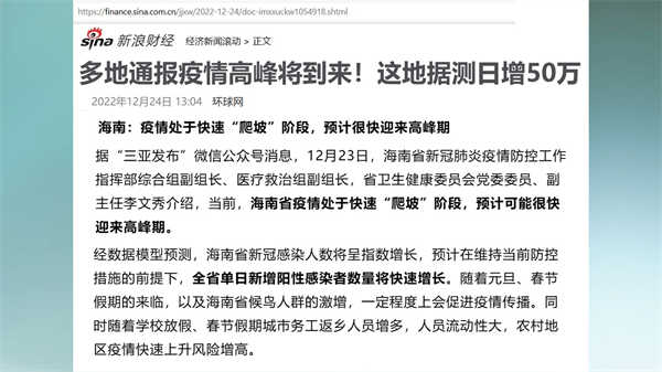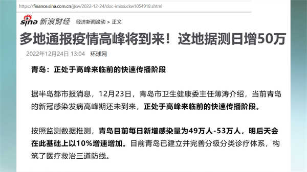 有人怀疑甚至否认这个报告的真实性,宣称,当局已经不再进行大规模的核酸检测,因而,不可能再获得这样全面的统计数字。这种说法似乎只是为了否定而否定。然而,前天,一则来自官方媒体的报道,否定了这种为了否定而否定的说法。《半岛都市报》报道,青岛市卫健委通报,青岛正处于高峰来临前的快速传播阶段,值得注意的是,通报提到,按监测数据推测,当地目前每天新增感染人数介于49万至53万人,此后两天会在这个基础上以10%的增速增加。青岛市可能是第一个公开承认有内部的检测数据,而且,承认感染规模巨大。对于青岛市的这个通报,胡锡进表示,这是全国各地首个大城市将日感染量估算到50万级的规模,突破了以往的计算模式,是一次实事求是的勇敢实践。只是,胡锡进可能夸赞得早了一点,青岛市的这个通报很快便被删改了,最关键的部分已经不见了。显然,青岛市的做法没有得到最高当局的认同。此外,东莞市卫生健康局也在当天发布了一则消息:新冠感染高峰日益逼近,根据数字模型预测结合专家评估判断,眼下,东莞感染者正以每天25万~30万人的规模增长,且增速越来越快,众多医疗机构和医护人员承受着史无前例的严峻挑战和巨大压力,请多理解一线医护人员。再者,多个省市的地方当局近日也发出了疫情即将达到高峰的警示信息。其中,海南省疫情防控负责人对媒体表示,当前,海南省疫情处于快速“爬坡”阶段,预计可能很快迎来高峰期。这位负责人还提到,经数据模型预测,海南省新冠感染人数将呈指数增长。