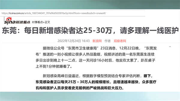 从过去几天的情况看,青岛市和东莞市的做法,可能还是特例。其他地方只是谈到大约什么时间达到感染高峰,至于感染规模多大则避而不谈。不过,不管是公开披露可能的感染规模,还是只说感染高峰何时到达,都说明了一点,当局内部有一套检测疫情的手段和方法,当局掌握疫情相关的数字。只是,这些数字不会告知百姓。这个情况并不令人感到意外,中共统治集团一向如此。对于当局来说,对一些重要数据的掌握,比如,重症人数,死亡人数,是一件轻而易举的事情。只消一个指示,这些机构就会立刻报告相关数据。显然,国家卫健委公布的数字缺乏可信度,并不是因为他们得不到真实数字,而是他们不想公布真实数字。青岛和东莞,这两个城市的人口都在一千万上下,青岛市的日增感染人数49万至53万人,东莞的日增感染人数25万~30万人,这些数字可能存在一些偏差,但是,这个偏差完全在可以接受的范围内,它足以指导百姓的生活和选择。青岛市和东莞市公布的日增感染人数完全可以证明全国日增感染人数3700万的真实性,完全可以证明网上流传的国家卫健委的会议纪要的真实性。
