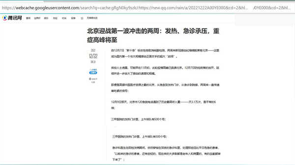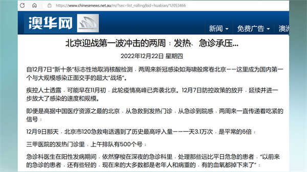 专注于医疗健康产业的智库型媒体《八点健闻》在22号曾经发表了一篇文章,题目是“北京迎战第一波冲击的两周:发热、急诊承压,重症高峰将至”。其中写道,新防控政策导致短期内难以准确统计感染数据和死亡数据,但有疾控、医院的一线人士判断,此轮感染高峰或许已经过去……文章还说,北京感染高峰只是前奏,重症高峰才是下一步真正的考验。关于重症高峰的问题,几天前,北京大学医院的专家王广发就已经表示,未来一到两周将会迎来重症高峰。这篇文章披露,一位中国疾病预防控制中心的人士表示,或许早在11月初,北京疫情就已经面临失控的局面,放开封控则进一步助长了感染的速度和规模。尤其值得一提的是,这篇文章说,按照国际经验,超大城市从正面受袭到度过感染高峰,往往需要2到3个月的时间。此次北京的半月过峰是无经验可参的全新情形。