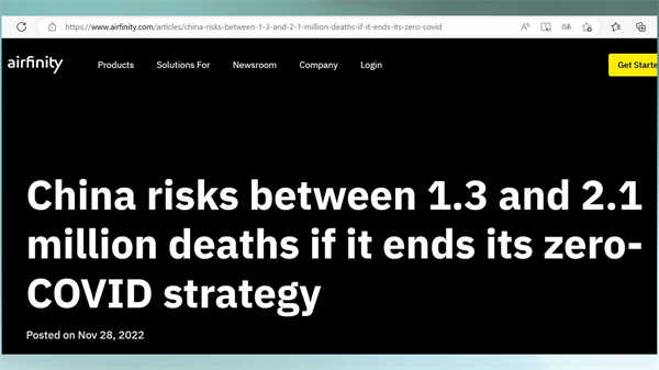 前几天,英国健康数据公司Airfinity发布了一项声明,他们估计,中国目前每天可能有5000多人死于病毒感染。这家总部设在英国的公司宣称,使用在中国各省区数据基础上建立的模型,得出的数字表明,目前中国每天的新增感染人数在百万以上。此外,这家健康数据公司还表示,按照他们的估算,本轮感染潮将在明年1月中达到第一个高峰,日新增感染者可达370万。第二个高峰将出现在明年3月,日新增感染可能上升到420万人。早在11月28日,这家公司就发出过预警,中国如果突然放宽严格的清零政策,可能会导致1.67亿至2.79亿人感染,130万至210万例死亡,其中大部分是未接种疫苗的老年人。