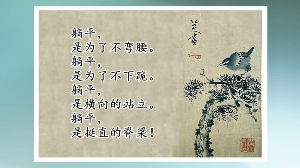 毫无疑问,这个时代,对于所有的中国人来说,特别是对于年轻人来说,实在是太沉重了。这些年,中国的政治日渐黑暗,中国的经济不断下行。特别是疫情流行这三年时间,当局严酷地防疫措施重创了中国的工商业,也迫使许多外国企业将供应链撤出中国。再加上习近平当局对互联网平台企业以及教育培训行业突然进行的疯狂打压,更是让中国的经济雪上加霜,就业形势急剧恶化,也让人们对中国的未来完全失去了信心。在此期间,不少年轻人选择了躺平,因为,这个时代太不公平,他们无论如何奋斗,也无法向上流动,也摆脱不了被剥削、被压榨的命运,他们永远买不起他们需要房子,他们永远也过不上他们想要的生活,他们根本看不到任何希望。选择躺平,实际是一种无声的反抗。就像这首诗所写的:躺平,是为了不弯腰。躺平,是为了不下跪。躺平,是横向的站立。躺平,是挺直的脊梁!