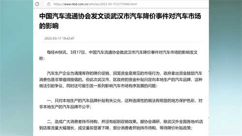 3月17日,中国汽车流通协会就武汉市汽车降价事件对汽车市场的影响发文称:此次武汉市、区政府的资金补贴只定向本地生产的汽车品牌,这种做法引起争议,同时还可能引发一系列影响汽车市场有序发展的问题。汽车流通协会的文章说,只对本地生产的汽车品牌补贴有失公允,这种选择性的做法有明显的地方保护色彩,;而且,此类补贴实施后,销量不增反降,如果任其发展,将对汽车产业的可持续健康发展造成极大损害。各地政府如果都效仿武汉,即只对所在地生产的汽车品牌进行补贴,这势必造成汽车市场的分割和市场秩序的混乱,有悖于《中共中央、国务院关于加快建设全国统一大市场的意见》的精神。