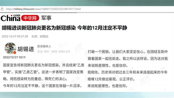 针对当局的这个决定,胡锡进表示,国家宣告将新冠肺炎更名为新冠感染,并且结束“乙类甲管”,实施“乙类乙管”。这进一步表明了国家改变策略、将防感染转为防重症、降死亡的决心。表明了防重症、降死亡的决心,这是胡锡进的解读,是对当局的吹捧和献媚。然后,胡锡进说,让我们大家坚定信心,在团结互助中跟着国家一起往前走。我之所以这样说,因为这对我来说既是理性,也是信仰。胡锡进说跟着国家一起往前走,是他的信仰,这话很值得玩味。这句话实际上是在说,他自己也怀疑当局这个决定,只能凭着信仰盲从。此外,他还说,相信历史将对把过去三年和未来连接起来的今年艰难12月做出客观、公正评价。显然,胡锡进意识到了,当局在12月做出的这一系列决定存在着极大的问题,并造成了难以挽回的严重恶果,只能等待历史的审判了。他知道,他也会站在被告席上。