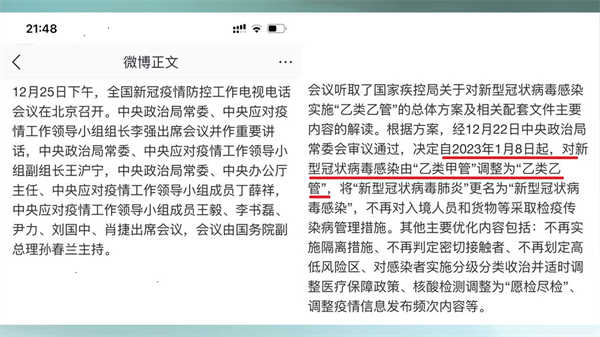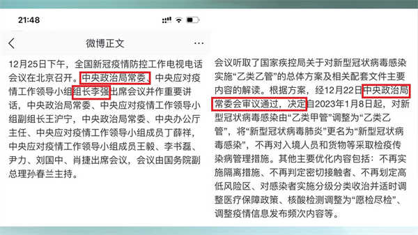 值得一提的是,就在当局发布公告前几个小时,有人在网上披露了一则消息,12月25日下午,全国新冠疫情防控工作电视电话会议在北京召开。会议的主要精神是:2023年1月8日起,对新冠病毒感染由“乙类甲管”调整为“乙类乙管”,将“新冠病毒肺炎”更名为“新冠病毒感染”,这些消息已经被当局的公告全部证实。值得注意的是,这则网上消息还提到“中央政治局常委、中央应对疫情工作领导小组组长李强出席会议并作重要讲话”,以及,国家卫健委的公告在12月22日经中央政治局常委会审议通过。奇怪的是,这些重要情况官方却没有做出公开报道,或者说,被有意隐瞒了。出台这样一个重大的决定,不仅没有一个大人物出来宣布,而且,还刻意隐瞒了这个决定的决策和批准的过程,当局明显在淡化这个重大决定的影响,想以一般性的政策调整展现给外界。以前,政治局常委会召开会议,分析疫情进行部署,当局都会大加报道,大肆渲染,而这一次却全然不同。显然,当局并不希望外界知道这些消息。尤其不想让外界知道,这个决定是由中共政治局常委会同意的,不想让外界知道,李强已经接任中央应对疫情工作领导小组组长。这也就意味着,他们知道这个决定存在着很大的问题,必将带来严重的恶果,他们不想为这个决定承担责任。