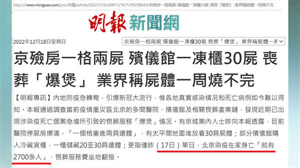 香港《明报》18日报道,北京多家医院近期出现死亡激增情况,而居家感染去世的人数则更是无法统计,市内多家殡仪馆均称目前处理尸体火化业务需排队多天,连停放遗体的位置都难以腾出,业界称尸体一周都烧不完。这篇报道其中提到,17号的那一天,北京在家身亡的就有2700多人。