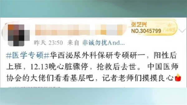 华西泌尿外科一位23岁的研究生,阳性发烧了3天仍在一线上班,不幸于2022年12月14日去世。