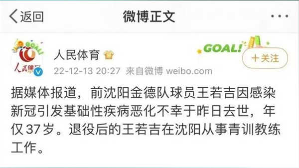 12月12日,前沈阳金德队球员王若吉,因感染新冠引发基础性疾病恶化不幸去世,年仅37岁。