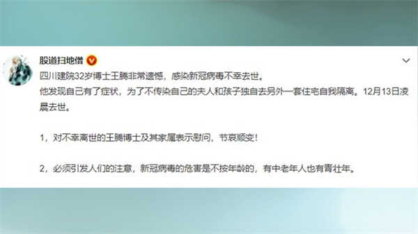 四川建院32岁博士王腾,感染了新冠病毒,为了不传染给夫人和孩子,独自去另外一套住宅自我隔离。12月13日凌晨去世。