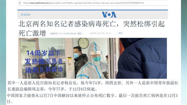 至于这几天因感染病毒去世的60岁以上老人的消息,网上就更多了。其中,就有业内有名的长城战略研究所创始人、董事长王德禄。根据网上的消息,他感染奥密克戎发现阳性,13日下午发烧,晚上吃了退烧药睡下,当陪护人员发现时已无生命特征,享年66岁。还有前人民日报知名记者杨良化近日去世,享年74岁。以及前中国青年报的周志春,今年77岁,12月8日去世。只有这两个报人去世,得到了官方的承认。