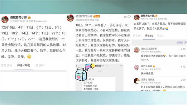 由于北京市的特殊地位,发生在北京的情况得到了国际社会的高度关注。实际上,北京发生的事情在全国各地也都在发生,甚至,一些地方可能比北京还要严重。这几天,网上就有河北省一些地方死亡人数急剧增加的消息。一位在当地县殡仪馆工作的员工,发布了近几天的情况,死亡人数从12月10日的四人,增加到了17日22人、18日31人。而这个临近北京的县,人口只有37万。12月前,平均每天只有四、五人去世,目前的死亡人数已经是平时的5、6倍了,而且,今后可能还会增加,因为,高峰期还在后边。只是,这位工作人员受到了威胁,不再继续发布新的消息了。