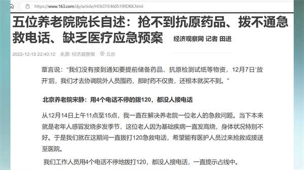 显而易见,对于这波疫情的到来,中共当局根本就没有做基本的准备,因而,出现了极大的混乱。这一点即使从官方的报道中也可以看出。昨天,《经济观察报》刊登了一篇文章,介绍了几家养老院面临的困难:抢不到药品、拨不通急救电话。这篇文章谈到,养老院没有接到通知要提前储备药品、抗原检测试纸等物资,12月7日放开后,那时药不仅贵,还根本就买不到。还有,12月14日,养老院的一名老人一直处于发烧状态,四位工作人员用四部手机持续拨打120急救电话,4个小时未能接通,老人在长时间等待中去世。