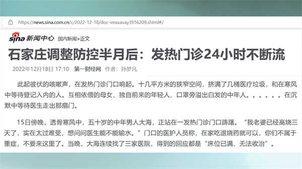 第一财经网还刊登了一篇有关河北省石家庄市的报道,调整防控政策半月后,发热门诊24小时不断流。其中写道,15日傍晚,透骨寒风中,一个五十岁的中年男人正站在一发热门诊门口踌躇。“我老婆已经高烧三天了,实在太过难受,想问问医生能不能输水。”门口的医护人员称,在家吃退烧药就可以,你们不属于重症,不要来这里了。当晚,这个中年男人连续找了三家医院,得到的回应都是“床位已满、无法收治”。此前,有专家提醒民众,连续两天高烧,就必须到医院诊治。可是,这位中年男人的妻子已经连续高烧三天了,还只能在家吃药。因为,医疗系统已经不堪重负了。可以推断,河北省的情况,一定不会比北京市更好。