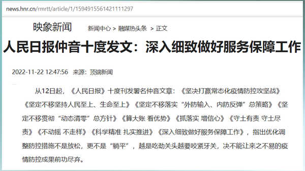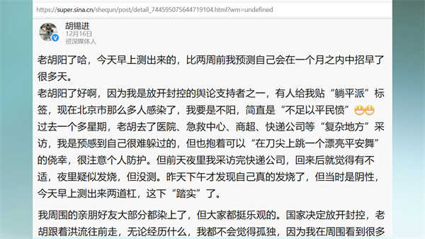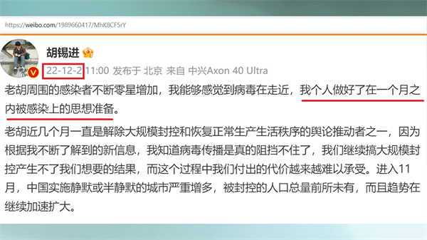 此前,中共的舆论工具不断强调病毒的危害,为清零进行辩护。在疫情失控后,又过分地淡化病毒的危险,给不少人造成错误的印象,乃至忽视必要的保护,甚至把感染病毒当作中奖一样。胡锡进在他被感染之后发文表示,老胡阳了哈,这下“踏实”了。我周围的亲朋好友大部分都染上了,但大家都挺乐观的。类似胡锡进的这种欺骗性的宣传充满了各大媒体,目的是让人们不去思考当局防疫的失败,让一些敏感的问题脱敏。