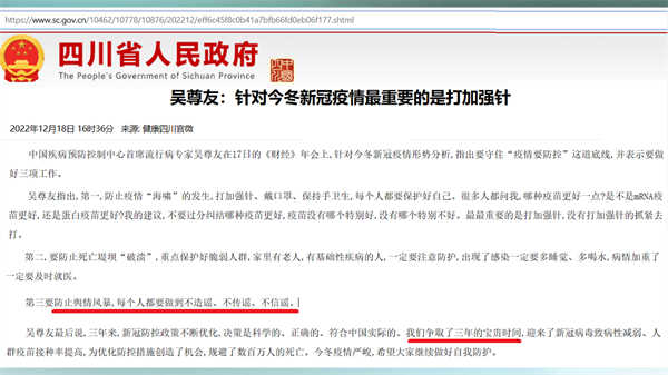 尤其值得一提的是,号称是中国首席流行病学家的吴尊友前天表示,要守住“疫情要防控”这道底线,防止疫情“海啸”的发生。同时,要防止死亡堤坝“破溃”。他说的这些其实都是一些常识,并不涉及专业措施。而且,他的这些话都是马后炮。因为,疫情“海啸”已经发生,死亡堤坝已经“破溃”。在此之外,他还特别提到,要防止舆情风暴,每个人都要做到不造谣、不传谣、不信谣。这句话才是他讲话的重点。这哪里是预防专家,这分明是维稳专家嘛。通过这番话,我们就可以知道,这位首席流行病学家他整天都在想什么。他关心的只是如何欺骗百姓,如何控制百姓。这样的专家怎么可能尊重科学,怎么可能尊重生命,他的话怎么能听信。