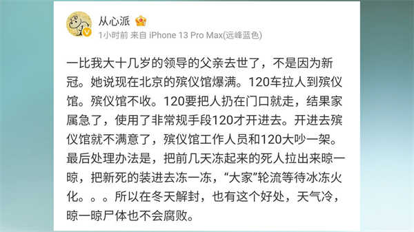 此外,有北京人发贴说,这次北京老年人死亡很厉害,平均每天三、四千人死亡,到3月15日供暖期结束时,可能有四十万人去世。