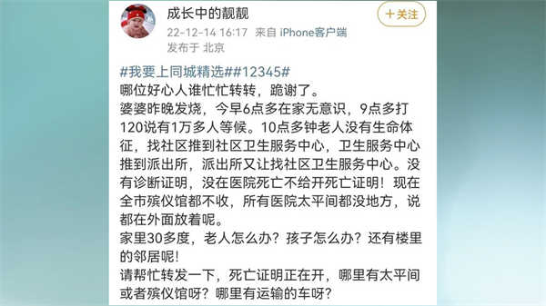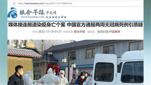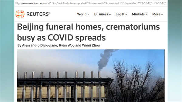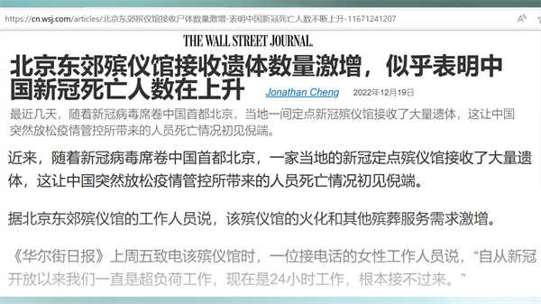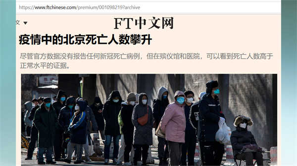 英国《金融时报》的报道“疫情中的北京死亡人数攀升”其中写道,尽管官方数据没有报告任何新冠死亡病例,但在殡仪馆和医院,可以看到死亡人数高于正常水平的证据。报道提到,北京东郊殡仪馆一名员工说,他们14日火化了150具尸体,比去年冬天的单日多了很多倍。北京八宝山殡仪馆的一位工作人员16日说,他们馆内尸体爆满,拉不过来了,殡仪车都排到12月20日,20日之前的约满了。北京昌平区殡仪馆的一位工作人员说,全市殡仪馆都爆满,他们这么一个小馆,一天就得烧超过100具遗体,而且尸体火化从15日排到25日。