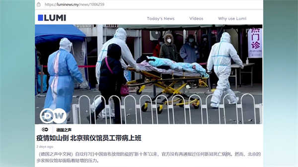 德国之声的报道“疫情如山倒、北京殡仪馆员工带病上班”,其中提到,自12月7日中国宣布放宽防疫的”新十条”以来,官方没有再通报过任何新冠死亡病例。然而,北京的多家殡仪馆却面临着陡增的压力,许多已经被感染的员工也不得不带病上班。