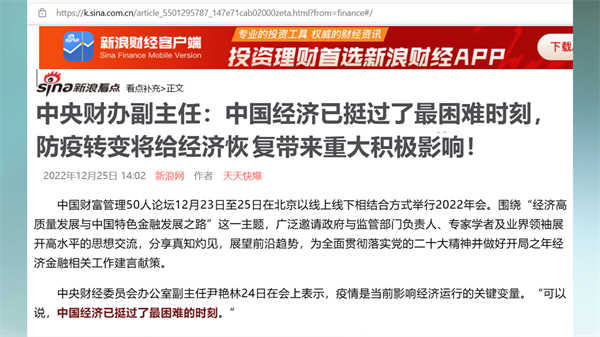 只是,这一切在中共当局那里都不值一提。这样短的时间内,全国90%的人被病毒感染,在他们那里看不到丝毫的悲痛和沉重,反到像是一件大喜事。按照当局的意思,持续了三年的疫情马上就要结束了,今后,中国不会再受到疫情的干扰,可以全力以赴发展经济了。在半个月前,中央财办副主任曾经对外表示,中国经济已挺过最困难时刻。他说,疫情是当前影响经济运行的关键变量,等等。他特别强调随着优化调整疫情防控政策的落实,人流、物流将更加顺畅,经济社会生活各领域都有望加快恢复,经济活力将得到有效释放。