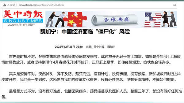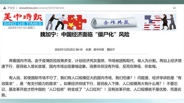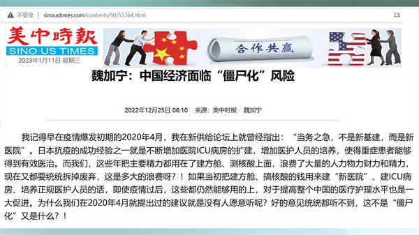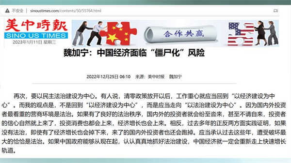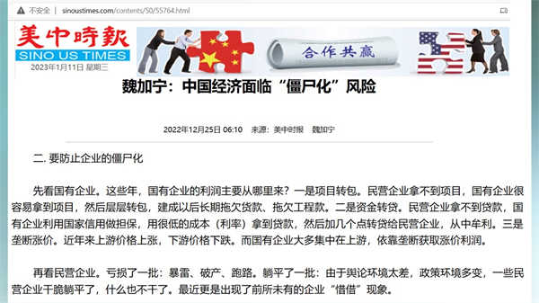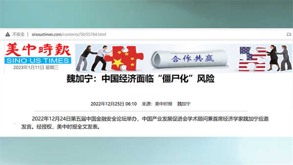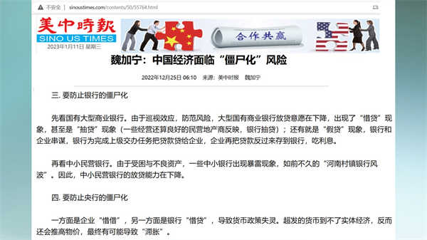 更严重的问题是,整个经济都失去了活力。就像著名的经济学者魏加宁所说的,中国经济出现“僵尸化”风险,从市场、企业、银行、财政和政府都在僵尸化。魏加宁过去长期任职国务院发展研究中心,对全国的经济状况非常了解,现在任政法大学教授,对经济问题的根源会有更深的探究。半个多月前,就在中共召开中央经济工作会议后不久,魏加宁在中国金融安全论坛上发出警告,伴随着经济下行,中国经济出现“僵尸化”风险,从市场、企业、银行、财政和政府都会僵尸化。值得注意的是,谈到政府僵尸化这部分,魏加宁着重批评突然“放开”问题,认为“时机不对、姿势不对、方式不对”,在流感易发的冬季“突然掉头,猝不及防,落荒而逃。没有计划,没有步骤,没有预案”。或许,正因为如此,魏加宁的这个讲话迅速遭到了当局的封杀。