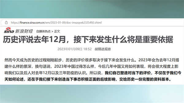 就在几天前,胡锡进推出了一篇短文,题目是“历史评说去年12月、接下来发生什么将是重要依据”。胡锡进在文章中写道,今天成为历史的过程刚刚起步,历史的评价很多取决于接下来会发生什么。2023年会为去年12月搭建什么样的景深,换句话说,2023年中国过得怎么样,今后几年中国又将如何表现,将会很大程度上影响我们以及后人对去年12月以及三年防疫的认识。