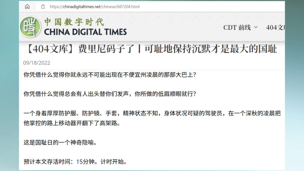 根据网上流传的相关讯息,转运涉及疫情人员的大客车需要封闭行驶,不许打开车窗,甚至,不许开空调,以防病毒外泄。在这样的环境中司机还需要身着防护服、头戴隔离罩,这本身就会造成司机身体不舒服,严重影响司机的观察和驾驶,再加上,又是在凌晨时间行车,司机稍有闪失,就会发生交通意外。还有传说,当地为了在19日之前实现社会面清零,急忙把涉及疫情的人员转移至外地,所以,连夜运行。总之,当地急于实现清零,因而,不顾相关规定,更是无视百姓的生命安全,强行在凌晨将涉及疫情的人员长途转运至外地,最终造成了这样严重的后果。值得一提的是,按照有关当局的规定,在安全事故分级中,死亡10-30人,属于“重大事故”,死亡30人以上则属于“特别重大事故”。当局公布的这次事故的真实伤亡人数是否属实,还值得怀疑。当天,一篇题为“可耻地保持沉默才是最大的国耻”的文章写道,一个身着厚厚防护服、防护镜、手套,精神状态不知,身体状况可疑的驾驶员,在一个深秋的凌晨把他掌控的路上移动器开翻下了高架路。这是国耻日的一个神奇隐喻。
