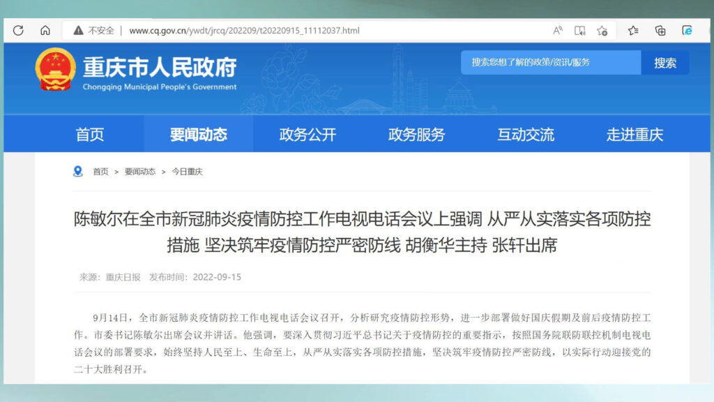 9月9日,中共副总理孙春兰召开国务院联防联控机制电视电话会议,提出要牢牢守住不发生规模性疫情的底线,以实际行动迎接二十大胜利召开,实际上就拉开了20大前强化清零行动的序幕。不仅贵州省,其他省市现在也同样高度紧张。紧邻贵州的重庆市,仅仅出现了10几个病例,也在强化各种防控措施。9月15日,重庆市委书记陈敏尔召开疫情防控工作电视电话会议,在这个会议上陈敏尔提到,国庆节临近,二十大即将召开,面对的防控任务更加繁重。全市上下要进一步把思想和行动统一到习近平重要指示精神上来,深刻认识做好当前防控工作的特殊重要性,严防死守,以实际行动迎接党的二十大胜利召开。通过这些公开的信息我们可以推测,目前这一波强化清零行动,可能直接源于习近平的推动。习近平显然不希望在20大召开的时候,再次出现武汉那样的情况,想必,当年武汉疫情失控已经在习近平的内心里留下了巨大的阴影。这或许就是陈敏尔提到的当前防控工作的特殊重要性。